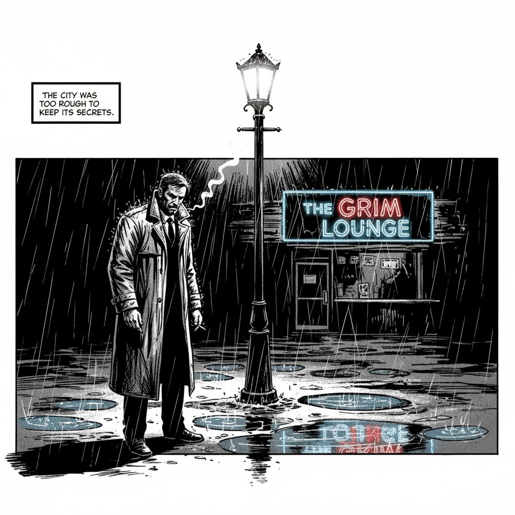 실제 프롬프트 예시: "높은 명암 대비의 흑백 잉크를 사용한 거친 누아르 아트 스타일의 만화책 패널 하나입니다. 전경에는 트렌치코트를 입은 탐정이 깜박이는 가로등 아래 서 있고, 어깨에는 비가 흠뻑 적시고 있습니다. 배경에는 황량한 바의 네온사인이 웅덩이에 반사되고 있습니다. 상단의 캡션 박스에는 '도시는 비밀을 간직하기엔 너무 험한 곳이었다'라는 텍스트가 있습니다. 가혹한 조명이 드라마틱하고 침울한 분위기를 연출하는 가로 비율의 이미지입니다."